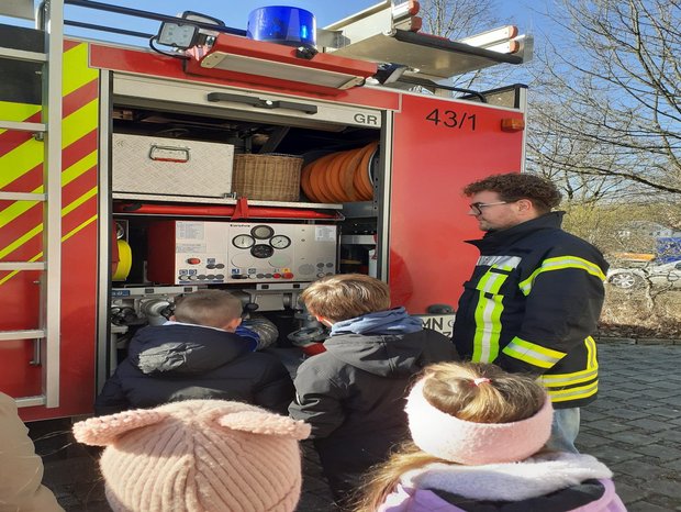 Am Freitag, den 20.03.2026, besuchte die Klasse 3b mit ihrer Klassenlehrerin Frau Kauer im Rahmen des HSU-Unterrichts die Illerbeurer Feuerwehr. Dort erfuhren die Schüler und Schülerinnen alles über die Aufgaben der Feuerwehrleute und deren ehrenamtlichen Einsätze. Außerdem wurde von den Fachleuten sehr anschaulich erklärt, was alles zur Ausrüstung eines Feuerwehrmanns gehört und jeder durfte einmal einen Schutzhelm, die schwere Feuerwehrjacke und die Schutzhandschuhe anziehen. Als Highlight durften die Schüler auf dem Fahrersitz des Feuerwehrautos Platz nehmen und den Innenraum mit den 9 Sitzplätzen der Feuerwehrleute mit all ihren Geräten inspizieren. Die zwei Stunden vergingen wie im Flug und am Ende bedankten sich alle bei den Feuerwehrleuten ganz herzlich für die spannende und gelungene Führung.