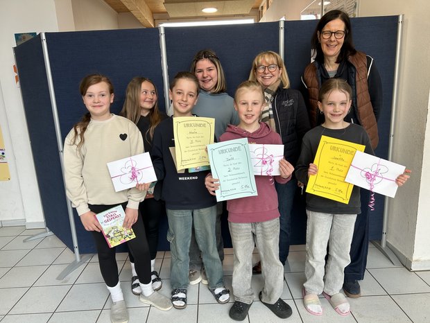 Im Rahmen der diesjährigen Bücherausstellung des Buchladens Schmid in Memmingen fand am Donnerstag, 12.03.2026 wieder unser schulinterner Vorlesewettbewerb der vierten Klassen statt. In den Wochen davor wurden in den Klassen 3/4 und 4 klassenintern die besten Leser und Leserinnen ermittelt. Diese durften zuerst in der Aula einen geübten Ausschnitt aus einem bekannten Buch vorlesen. Im zweiten Durchgang bekamen die Schüler und Schülerinnen dann einen ungeübten Ausschnitt aus dem Lesebuch vorgelegt. Die Jury setzte sich aus Frau Schmid vom Buxhladen Schmid, Frau Hebestreit und Frau Kerwien vom Elternbeirat, unserer Bürgermeisterin Frau Klinkhammer und unserer Rektorin Frau Hammelmann zusammen. Auch in diesem Jahr war es gar nicht so leicht, die Sieger und Siegerinnen zu ermitteln, da alle Teilnehmer sehr gut gelesen haben und sich sehr viel Mühe gaben. Den 1. Platz belegt Josefina Rauh vor David Müller und Maximilian Stich, die den 2. und 3. Platz belegen. Die Gewinner bekamen eine Urkunde und einen Gutschein vom Buchladen Schmid.